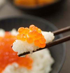 いくらは9月中旬頃から北海道の沖合いで獲れる鮭の卵(筋子)からすばやく皮をむいてばらした卵です。